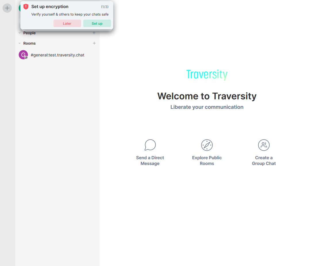 Element is the name of the secure chat client that we support and recommend for use. This is an open source application and is free to use. It has a highly active development community and the parent company which develops Element has received investment ensuring a healthy roadmap of features and ongoing support to the wider community. Since Element is essentially a stand-alone application it is not fully embedded into Traversity. This is an intentional design decision to enable what we believe is a superior user experience and better access to advanced features. This does mean that in some cases, such as logging in, you may be asked to enter credentials or connection information.