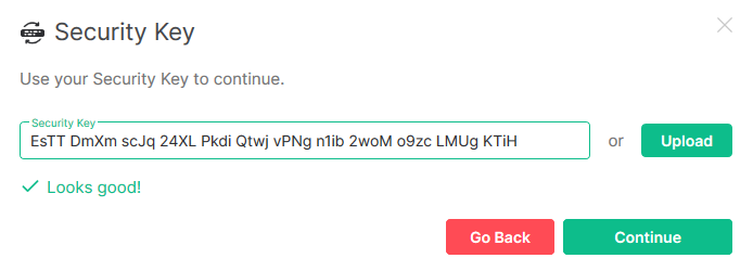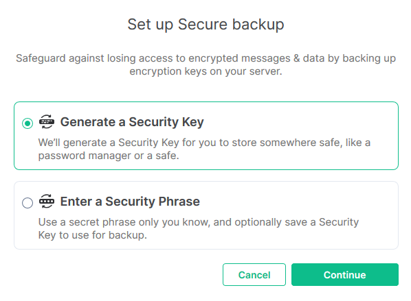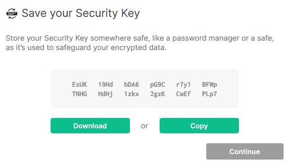 - Security Key - choose this option if you'd like to save a small text file in a secure location like a password manager. You should be able to access this file easily and it must be protected against accidental deletion. If you lose this file it will be impossible to retrieve your encryption keys and you will lose access to any conversations or data previously encrypted.