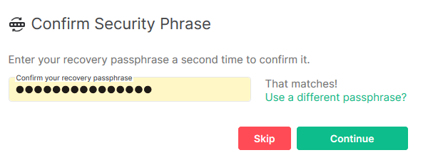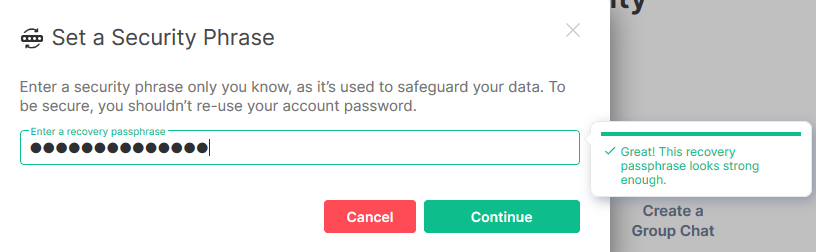- Passphrase - choose this option if you'd like to use something like password you can remember, and therefore do not need to store in a secure location. You will need to choose a strong passphrase that meets a high standard of complexity. As with the Security Key, if you lose or forget this passphrase you will be unable to decrypt previous conversations.