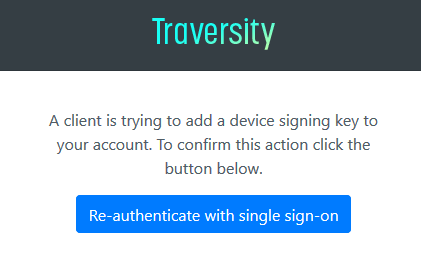 Before we can finish we need to verify that you are the owner of the Traversity Account that is being updated in the Secure Chat service. This step helps prevent people from hijacking your account and replacing your encryption keys.