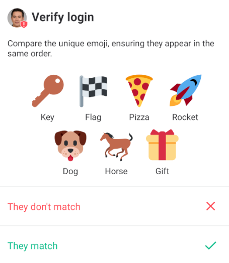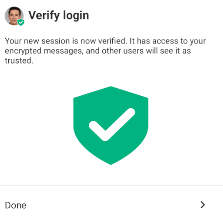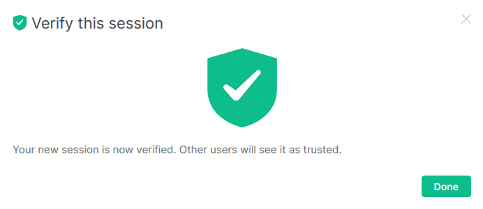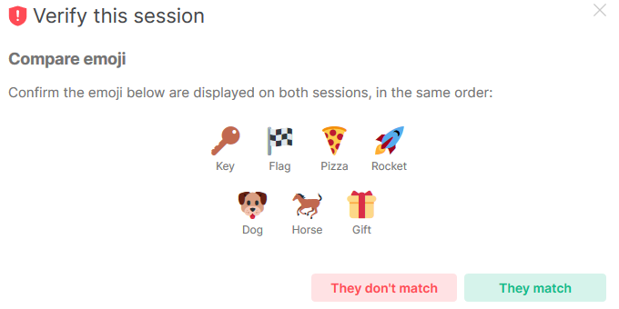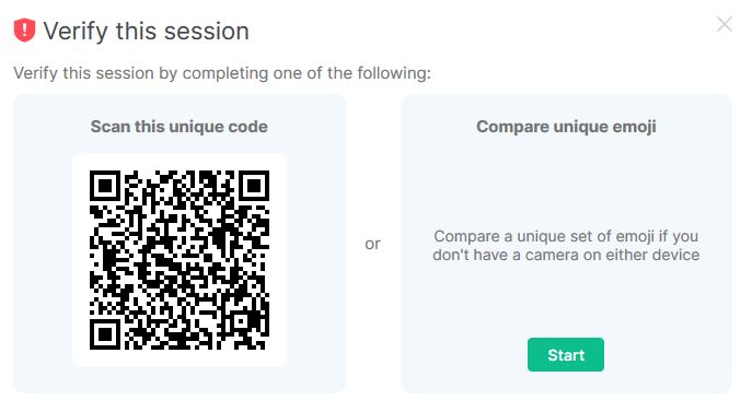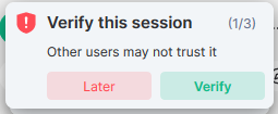 If you connect to Secure Chat with a new device, or have signed out, you may be asked to "Verify this session." This is an important step to verify that your new session is linked to your previous sessions, and will allow you to decrypt previous communications.