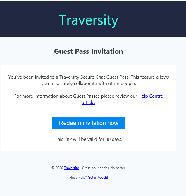 If you'd like to invite someone who isn't a Traversity member already, just use the lower part of the panel to add an email address where we can send a specially coded link to them. Enter 1 or more email addresses and then click "Invite Users" and we'll do the rest. They'll get an email similar to the one below which contains a magic link that will allow them to register and claim your invitation.
