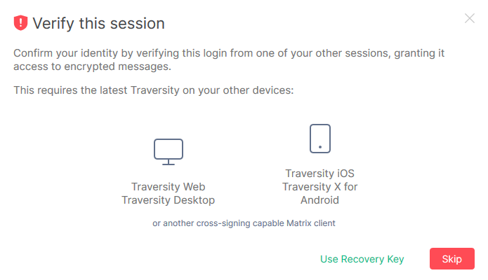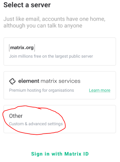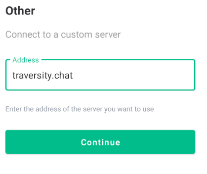 As both Matrix and Element are parts of a wider network, you will need to configure the app to connect to Traversity. Select to connect to "Other":
